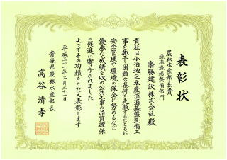 平成31年2月21日 第12回優良工事表彰の農林水産部長賞を受賞。
